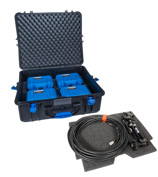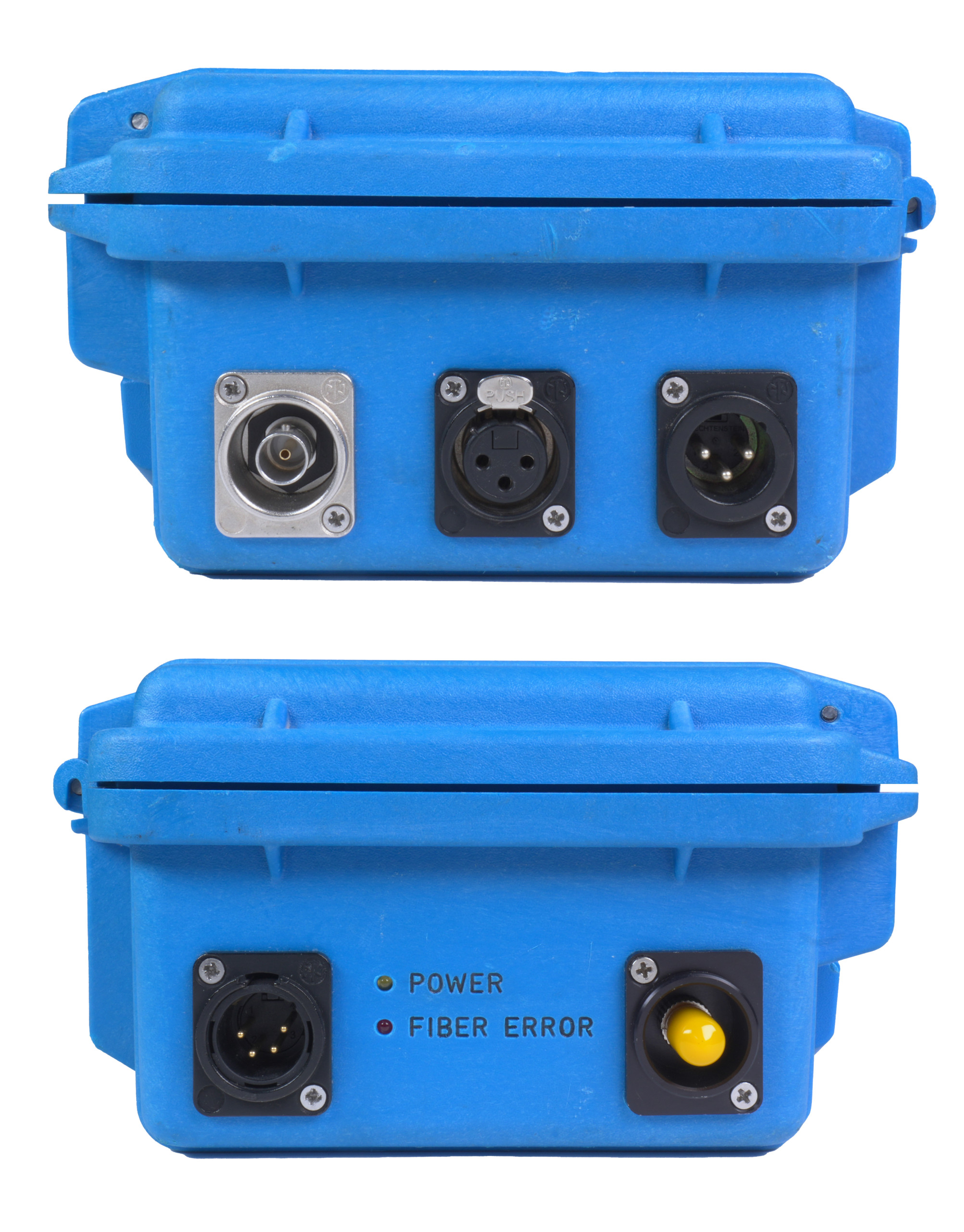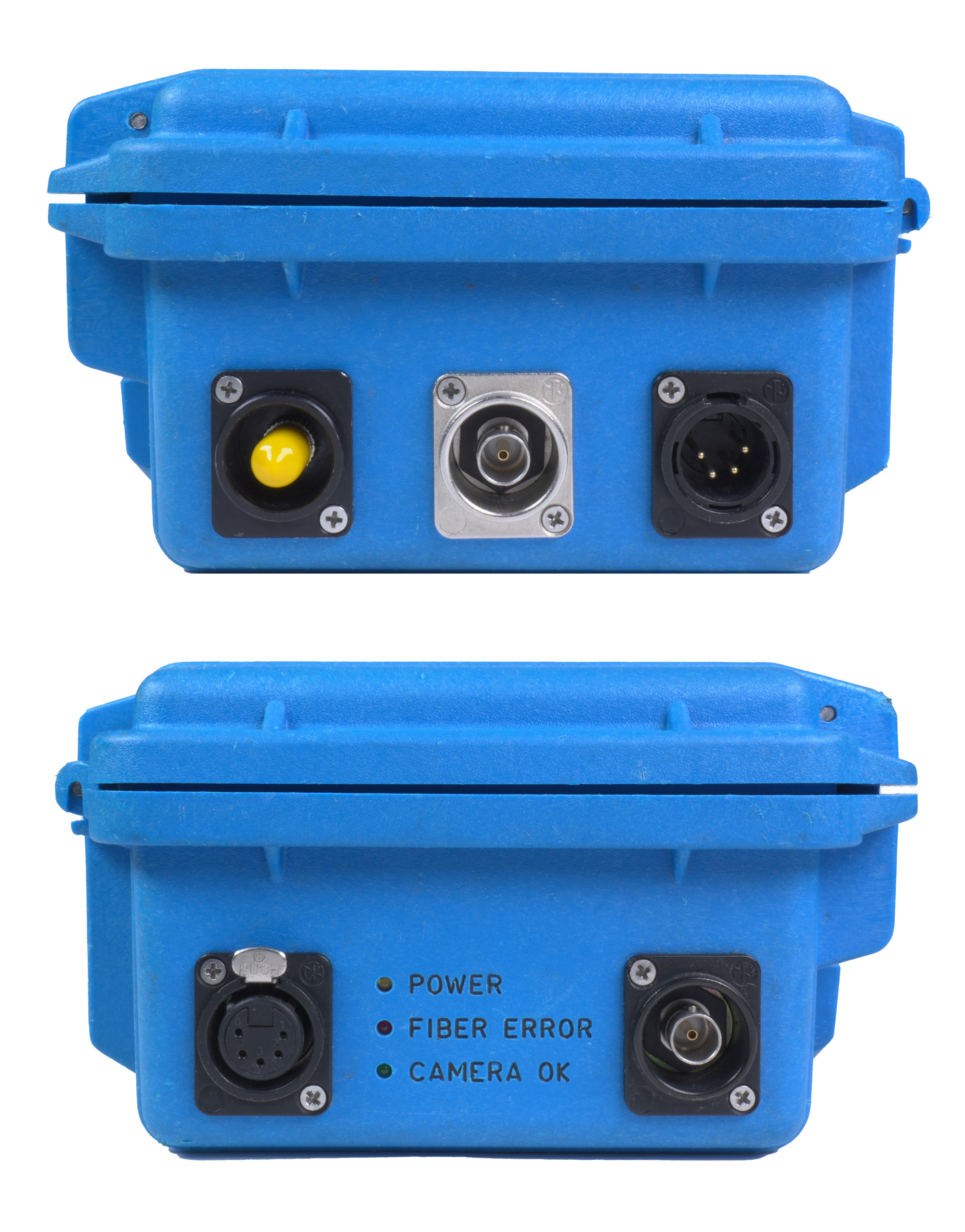 The fiber-optic transmitter, integrated into a durable Pelican case, accepts the camera’s output from the umbilical cable and doubles as a power supply for the camera.